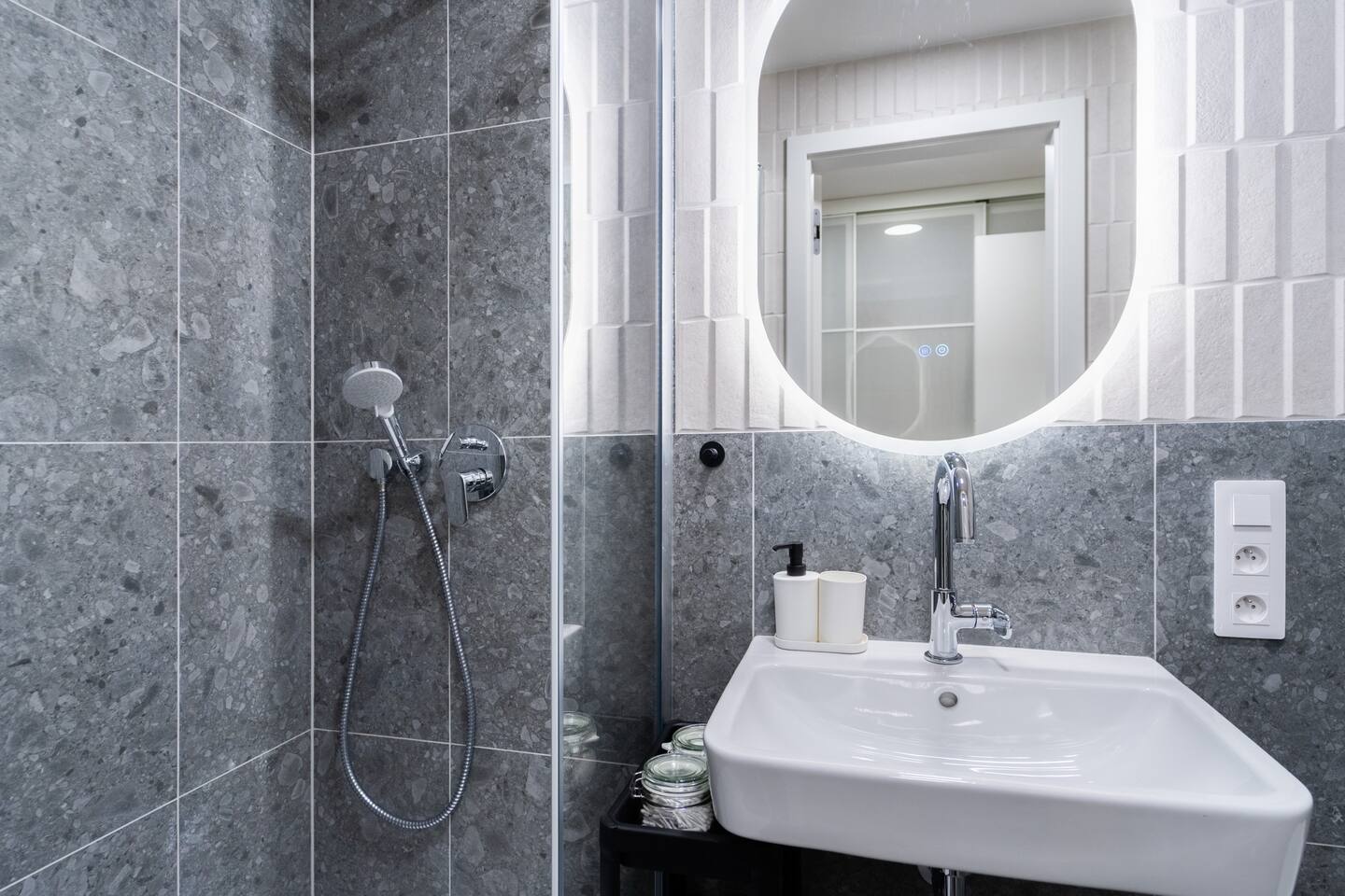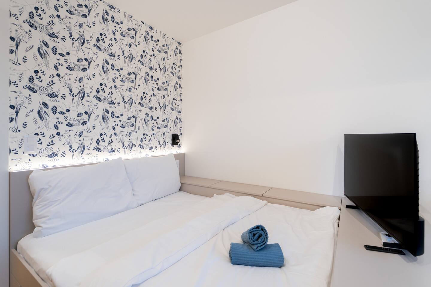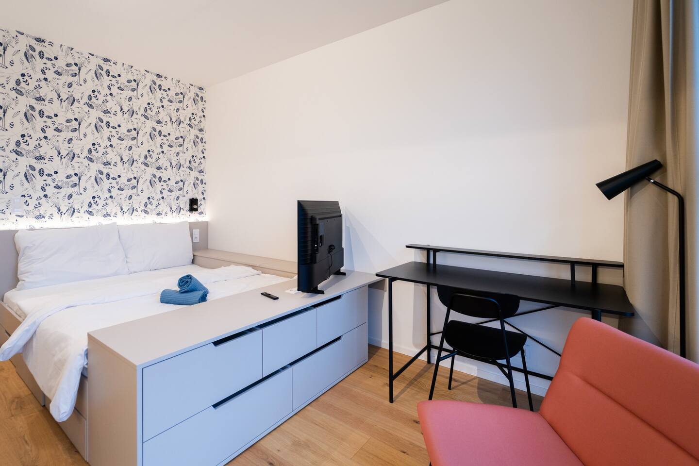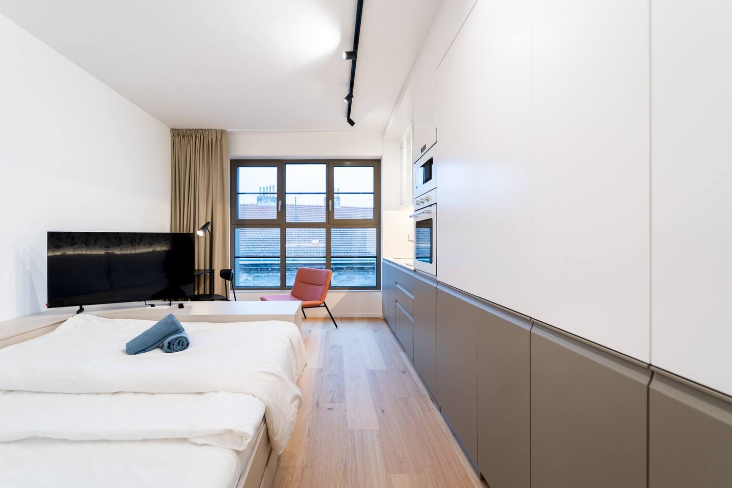 The studio includes a fully equipped kitchen, washing machine, TV and high-speed internet. The private bathroom features a shower. Jay’s balanced layout and neutral tones highlight modern comfort with practical elegance.
