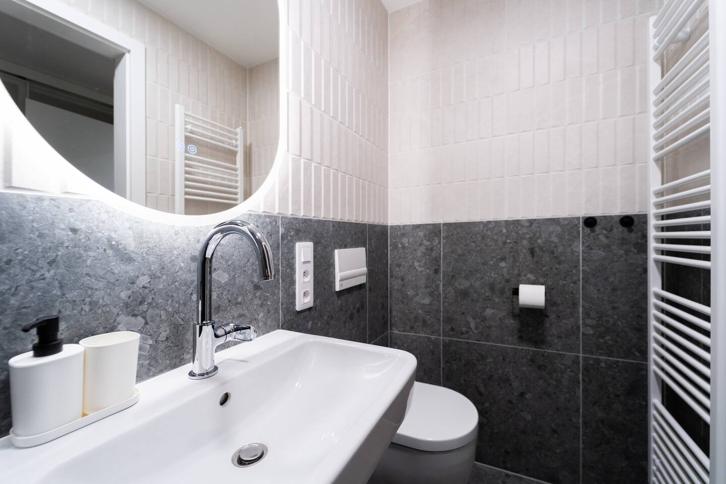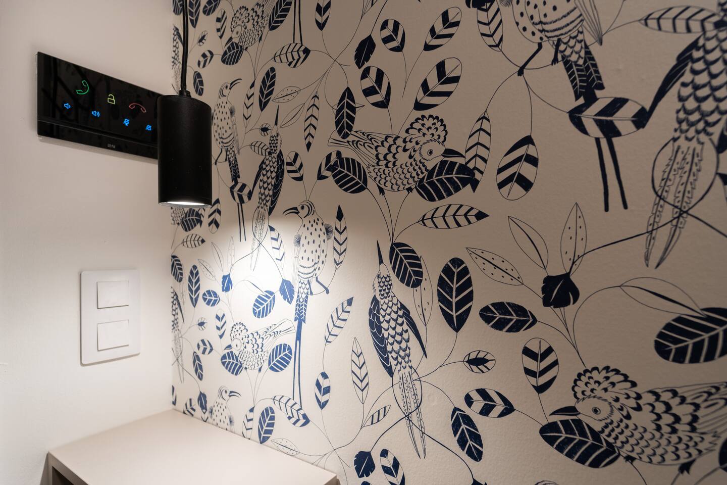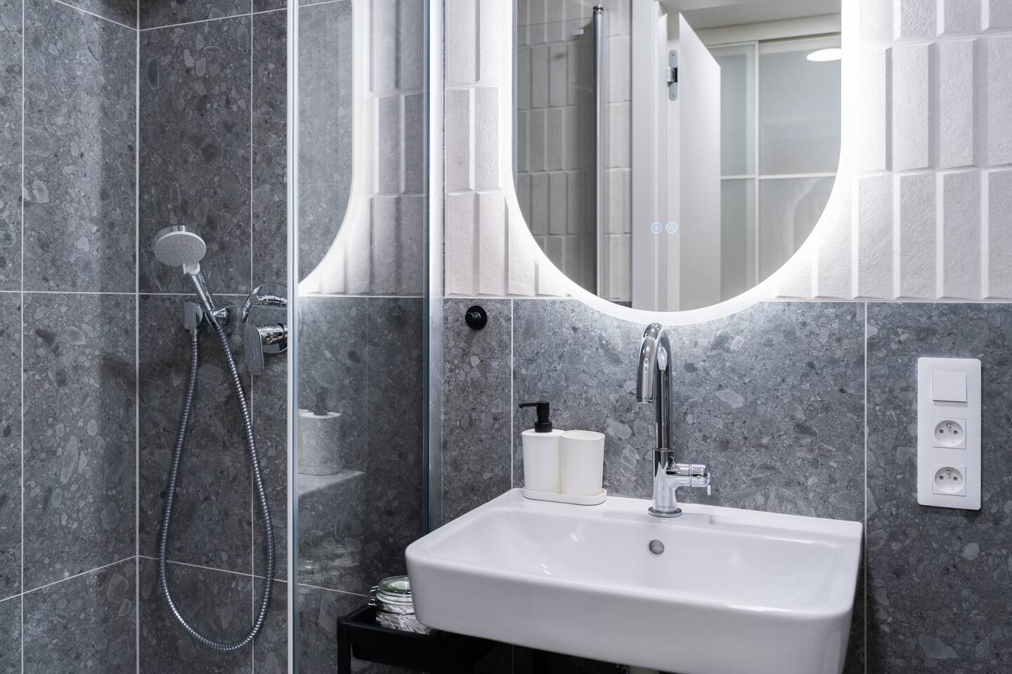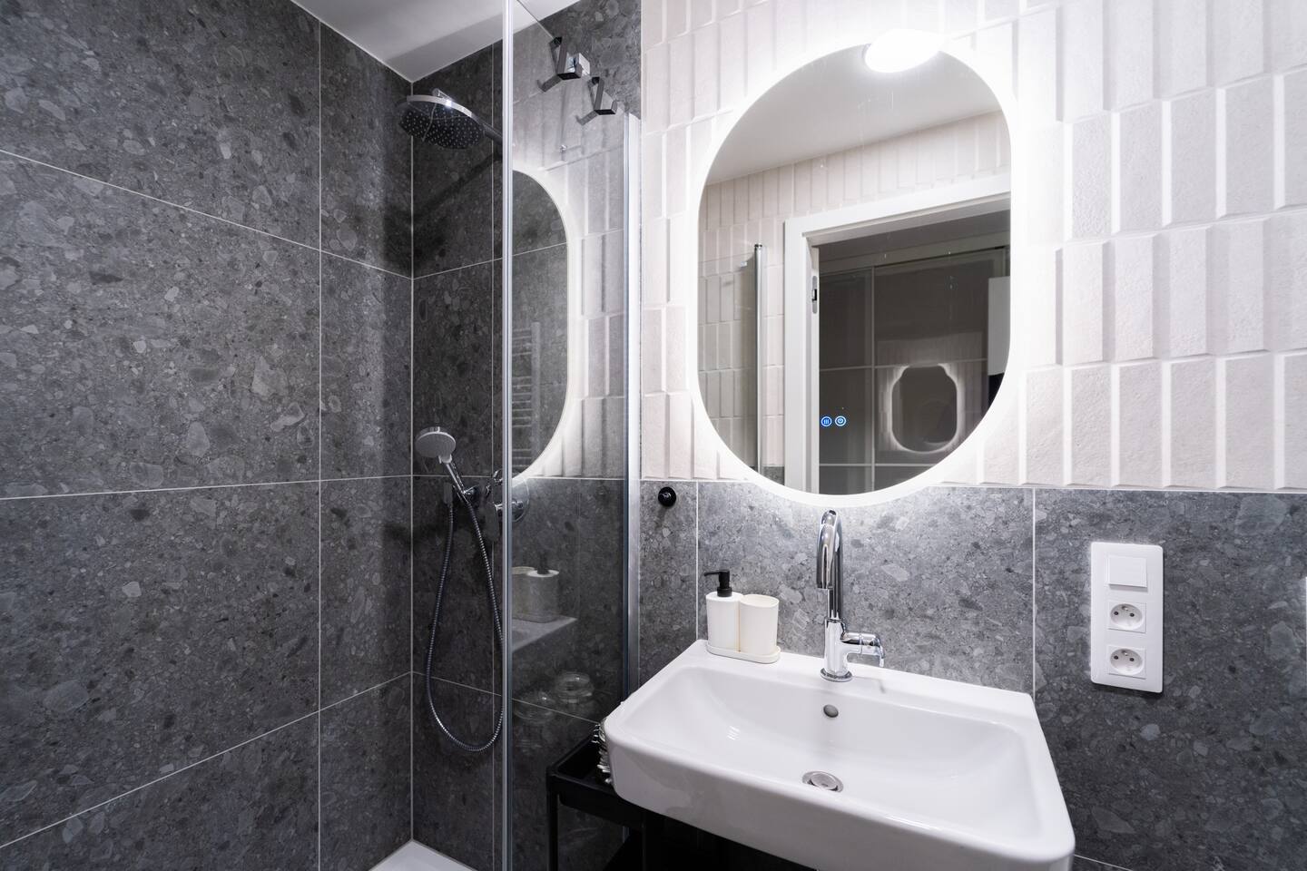 The studio includes a fully equipped kitchen, washing machine, TV and high-speed internet. The private bathroom features a shower. Jay’s balanced layout and neutral tones highlight modern comfort with practical elegance.
